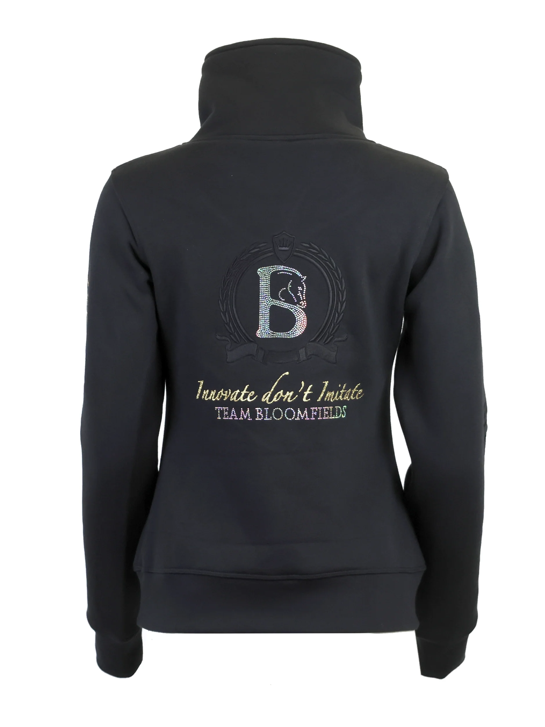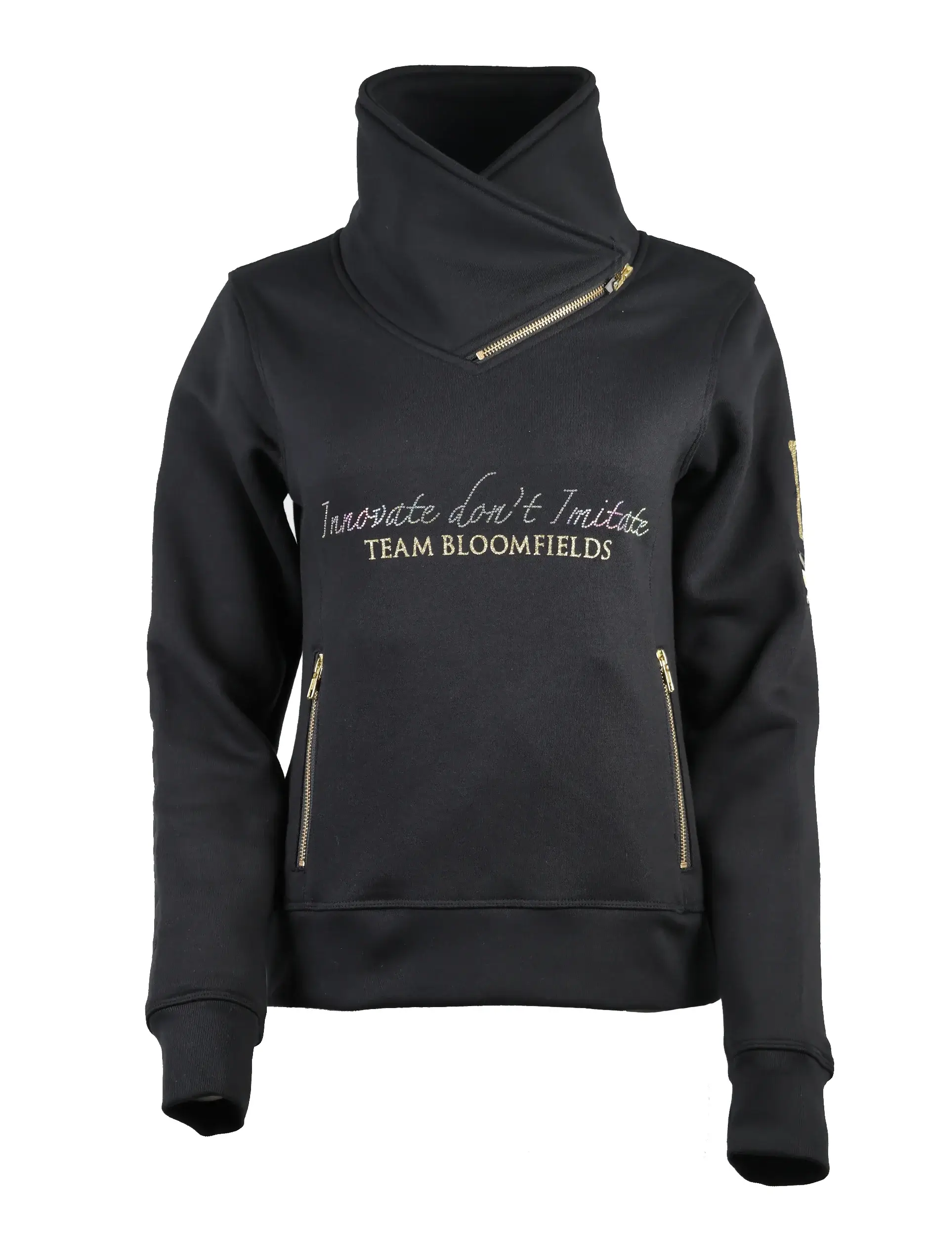 Op één mouw staat Team Bloomfields geborduurd, terwijl de andere arm is afgewerkt met het herkenbare Bloomfields ‘B’ logo in gouden steentjes en een Union Jack accent. Op de borst staat de krachtige tekst “Innovate Don’t Imitate” in goudkleurige branding. De achterkant is afgewerkt met Team Bloomfields over de rug en een opvallende Rhinestone ‘B’, waardoor deze top ook van achteren een luxe uitstraling heeft.