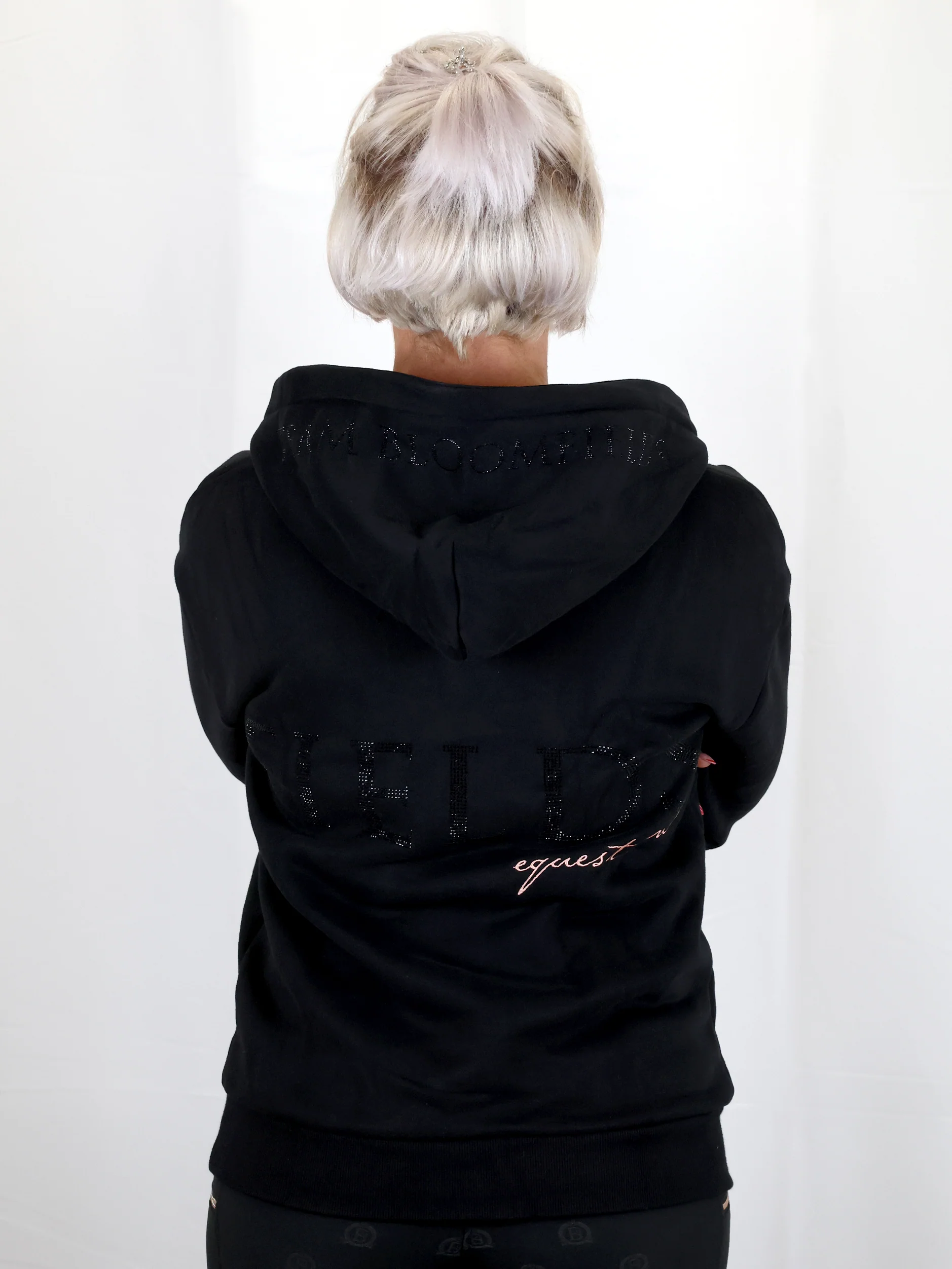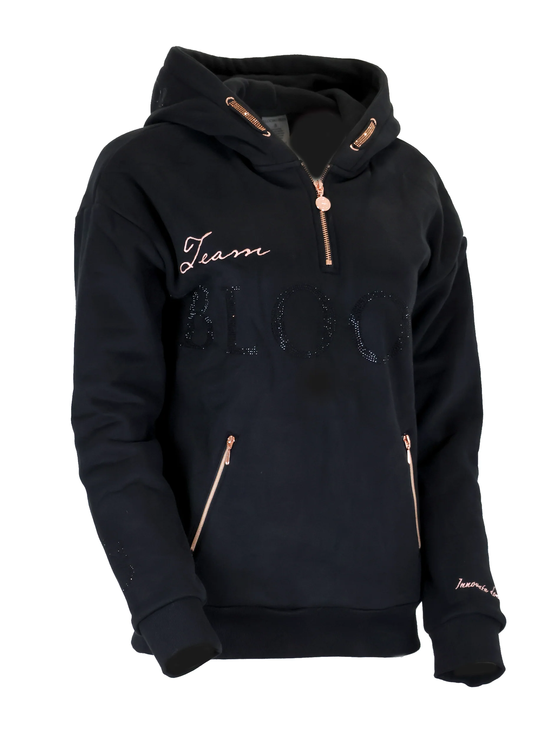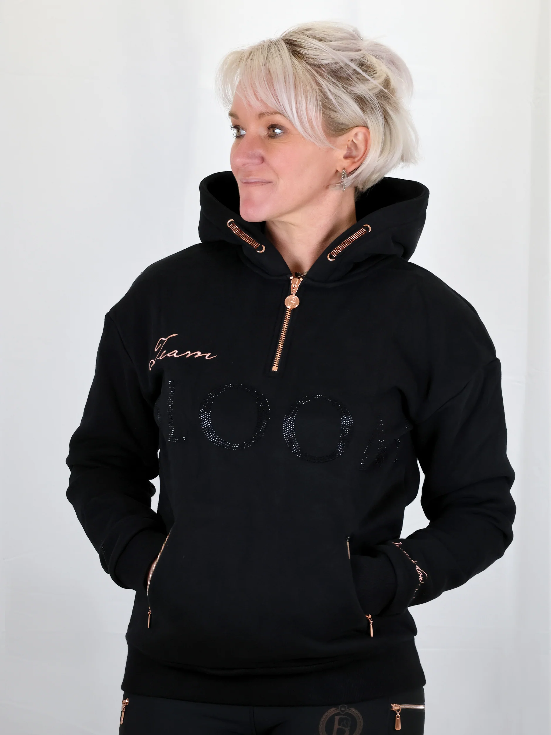 De Luna Black Rhinestone Logo Hoodie van Team Bloomfields is een hoodie met uitstraling. Comfortabel, modern en afgewerkt met luxe details in roségoud. Ideaal voor op stal, onderweg of gewoon casual.