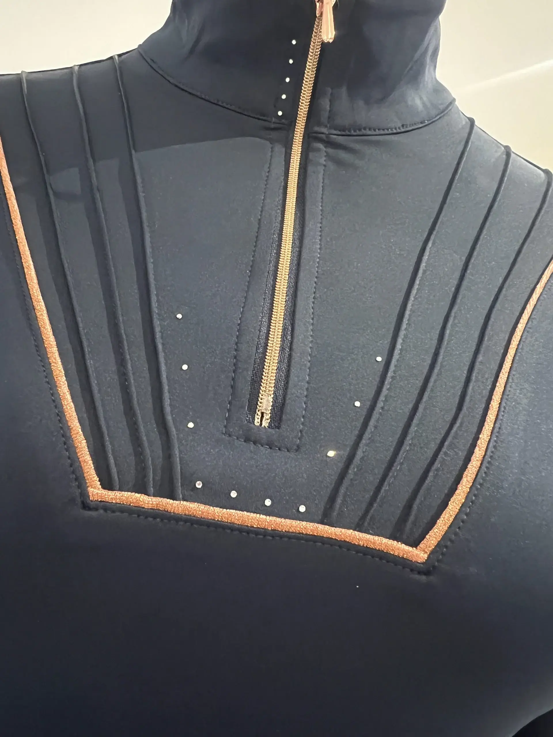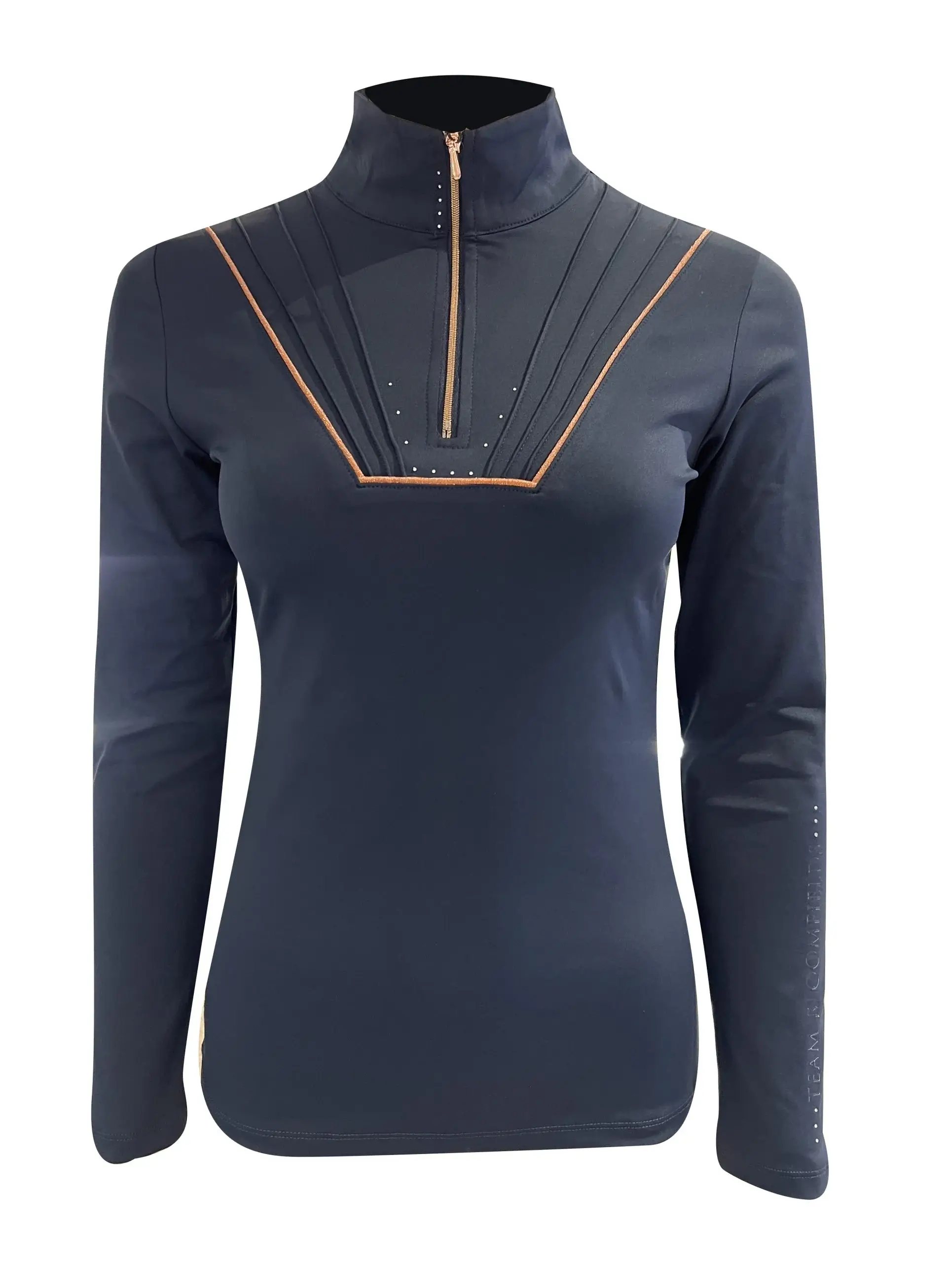 Deze base layer is uitgevoerd in een diepe navy kleur en afgewerkt met een roségouden rits en bijpassende accenten. De pasvorm is mooi aansluitend, waardoor hij prettig draagt onder een bodywarmer of jas, maar ook perfect gewoon als top te dragen is.