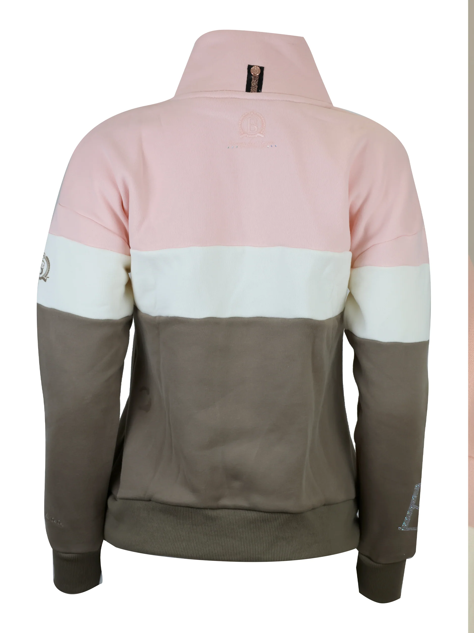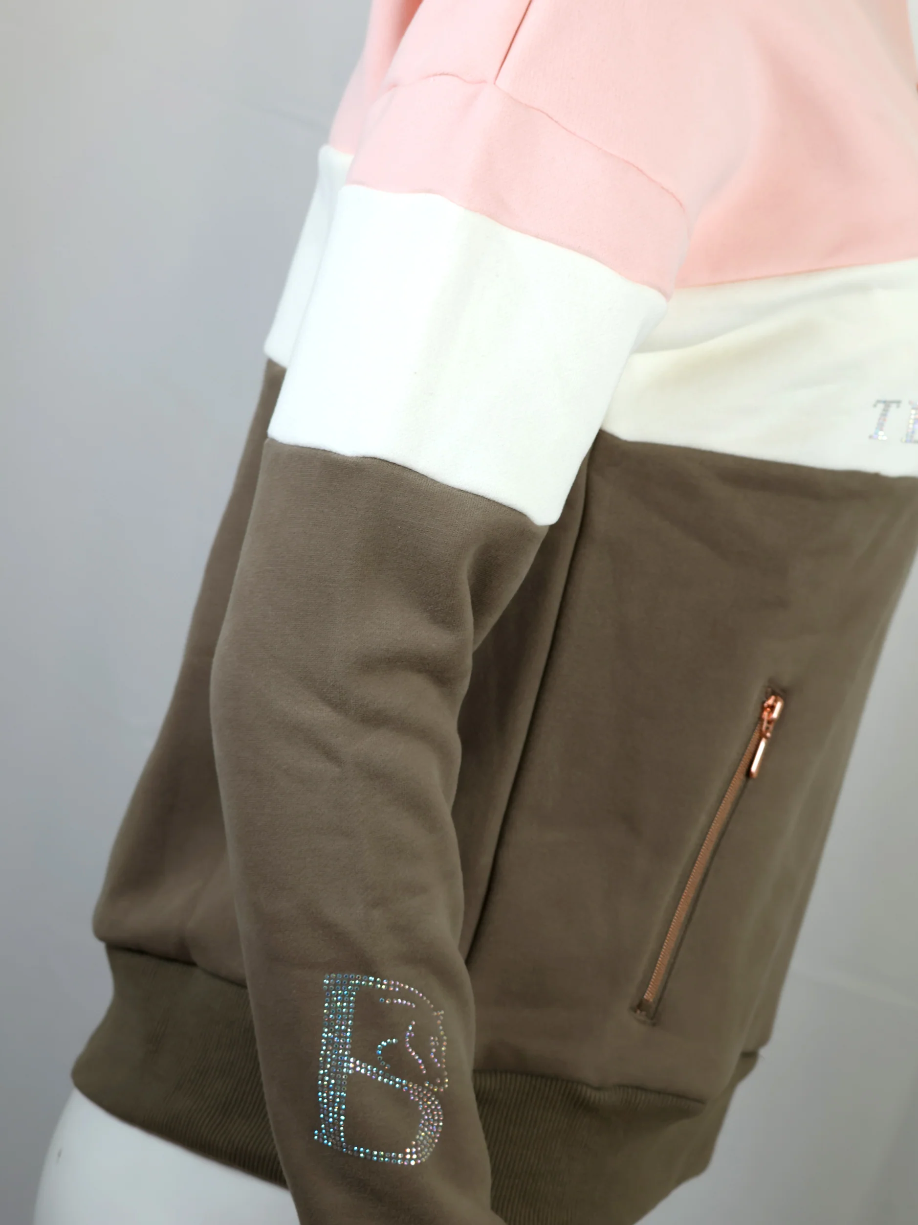 De Vanessa Tri-Colour Khaki V Neck Top van Team Bloomfields is een stijlvolle jumper met een luxe uitstraling. Uitgevoerd in drie kleuren: Pink, Cream & Khaki met roségouden accenten voor wanneer je houdt van chique met een sportieve basis.